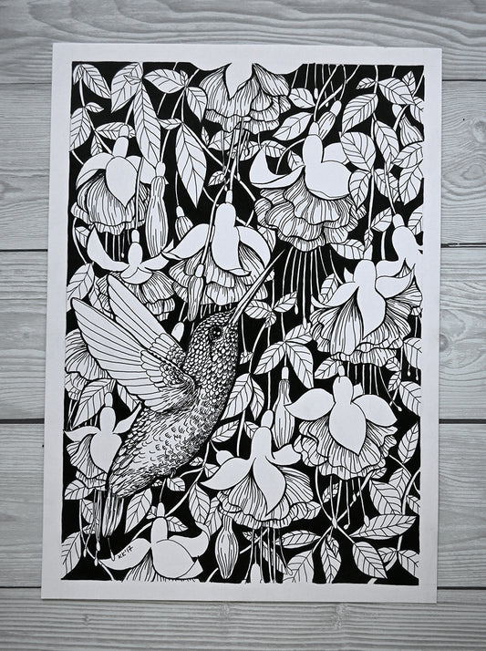 Hummingbird garden, ink drawing
